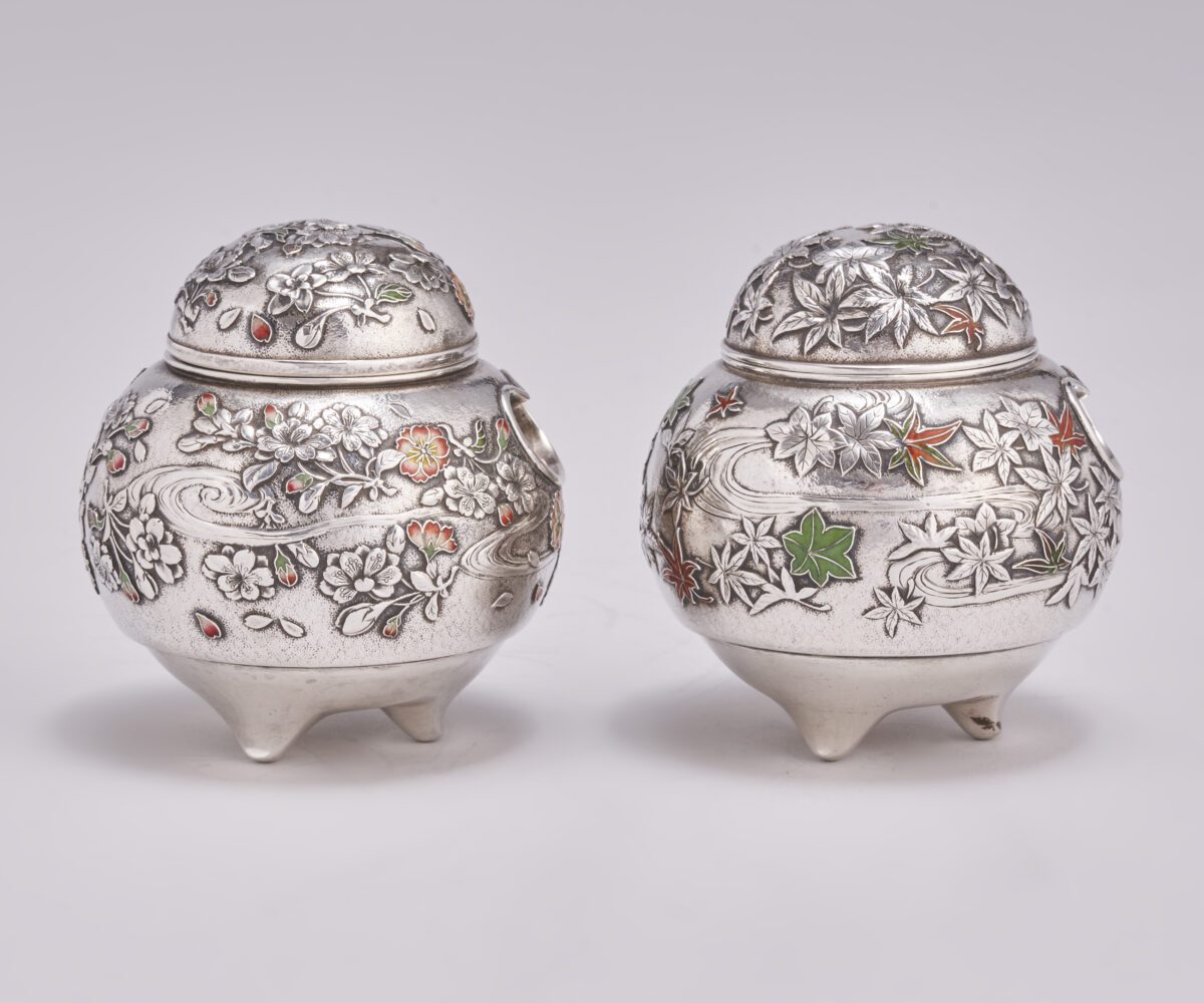 An attractive pair of small Japanese Silver and enamel Koros signed Nemoto (Circa 1880)