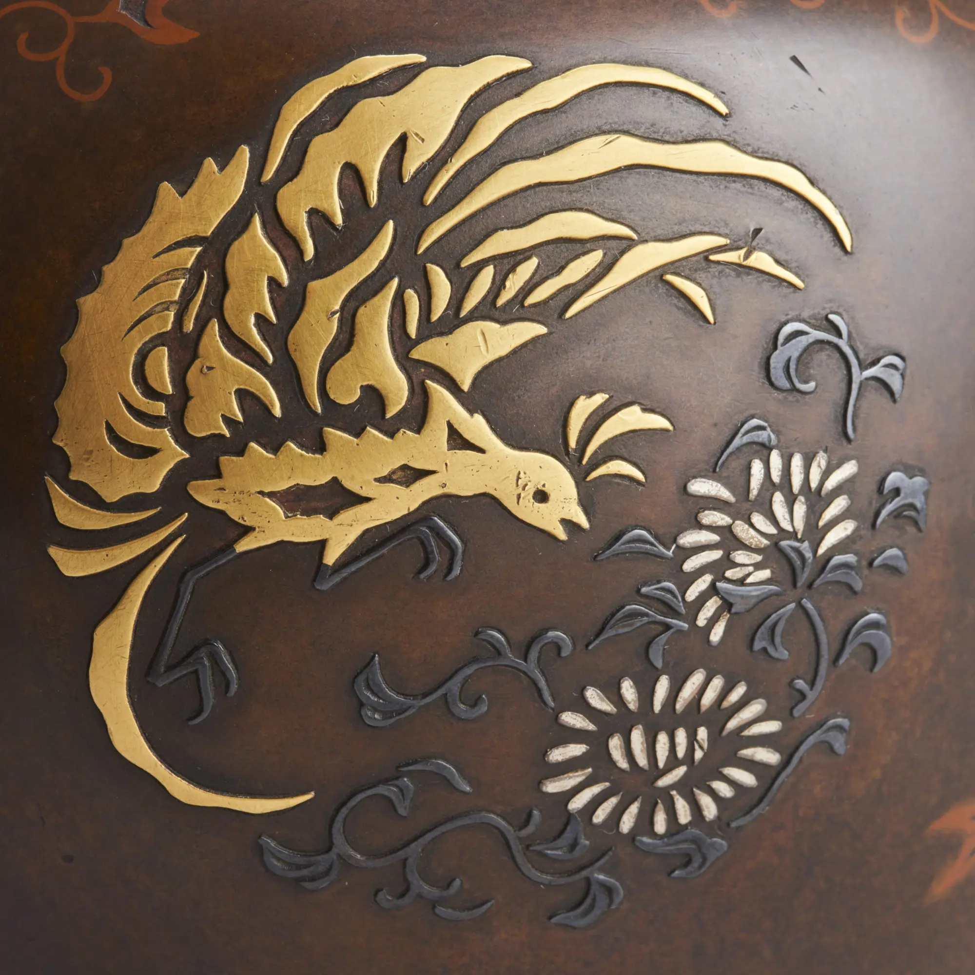A close detail of a multi-metal Phoenix on a fine Japanese Meiji-era Bronze vase