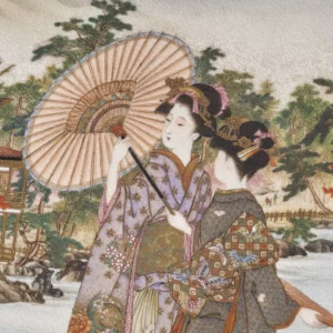 A more traditional and idyllic depiction of Japanese women as two noble ladies in elegant robes stand at the edge of a lake on this Satsuma dish by Sozan