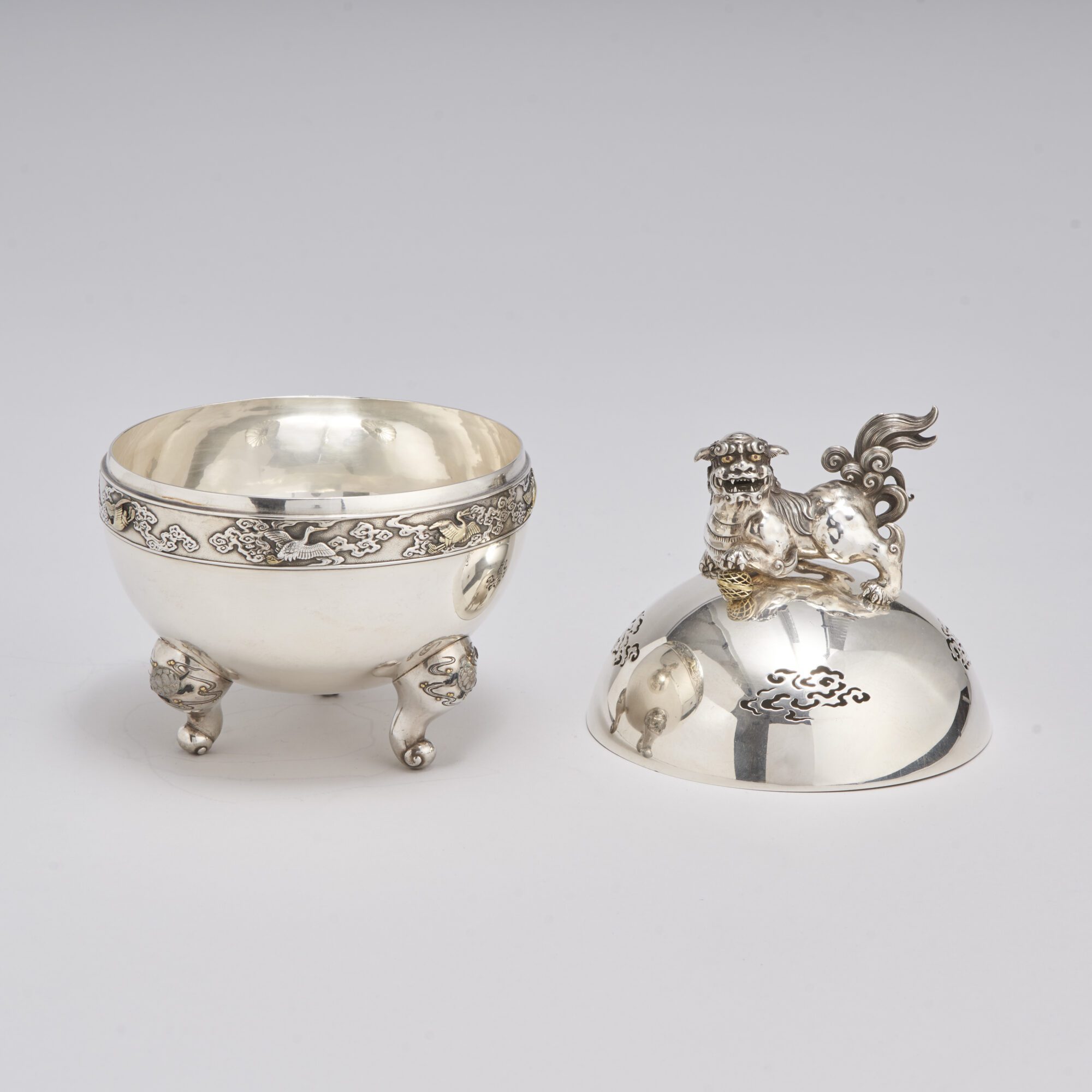 From our collection of fine Japanese metalware of the reign of Emperor Meiji, (1868-1912) is this attractive Silver Koro of spherical form standing on three cabriole feet.