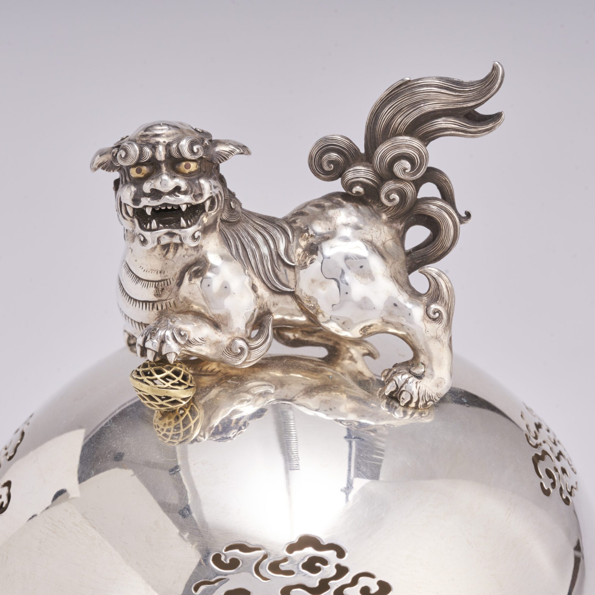 The cloud motif is repeated in the pierced design of the lid which itself is topped with a large, playful Shishi dog with its front left paw slightly raised as it traps a Gold ball.