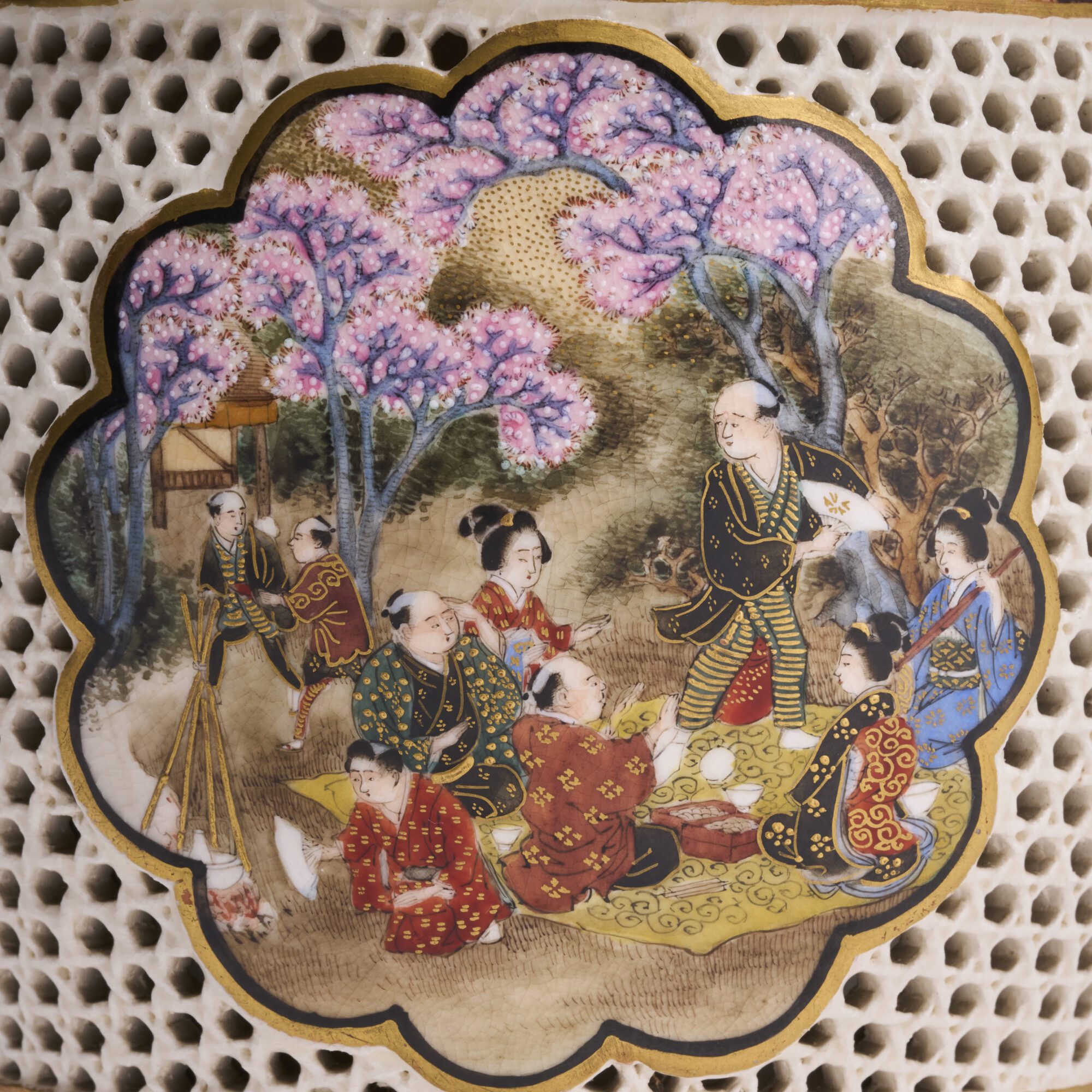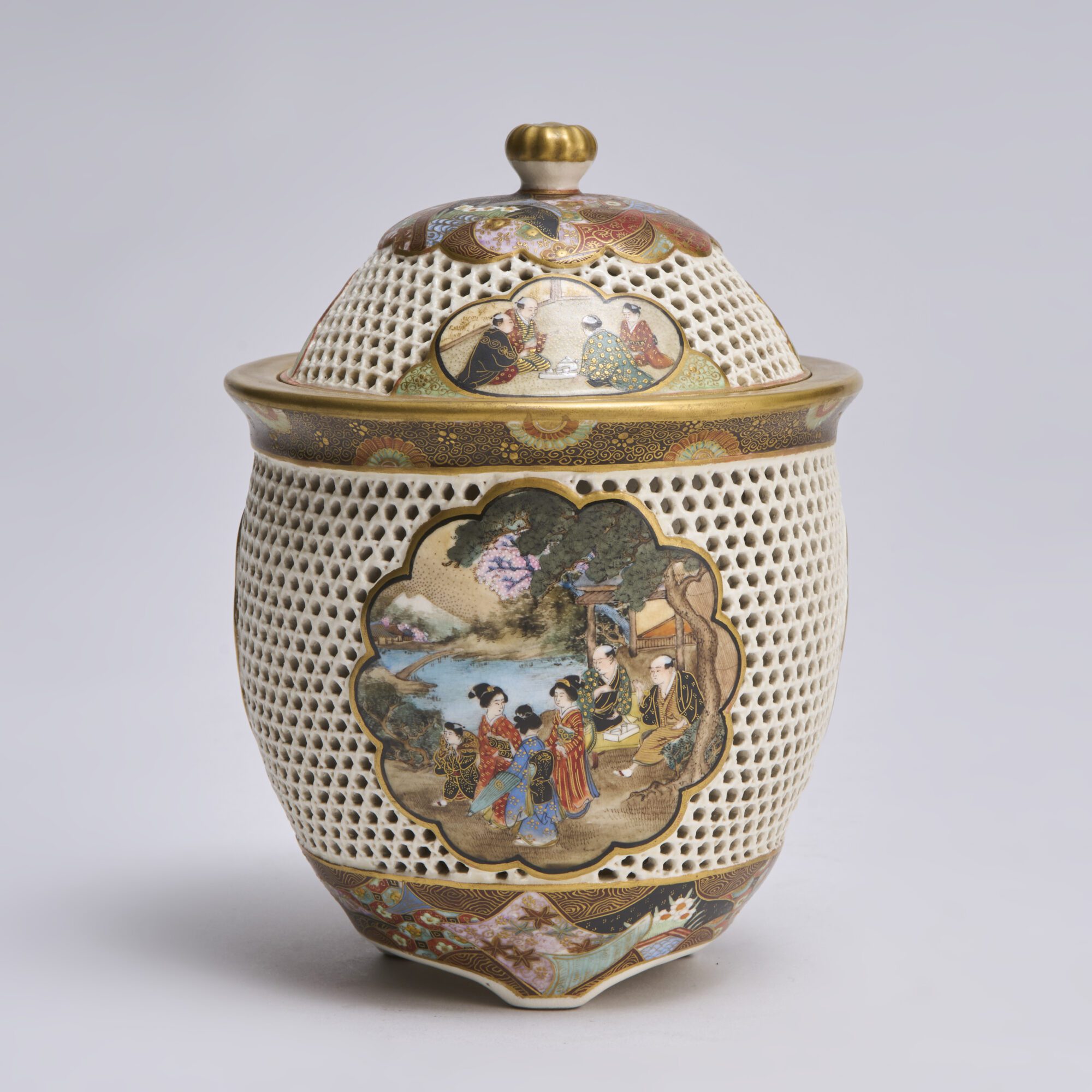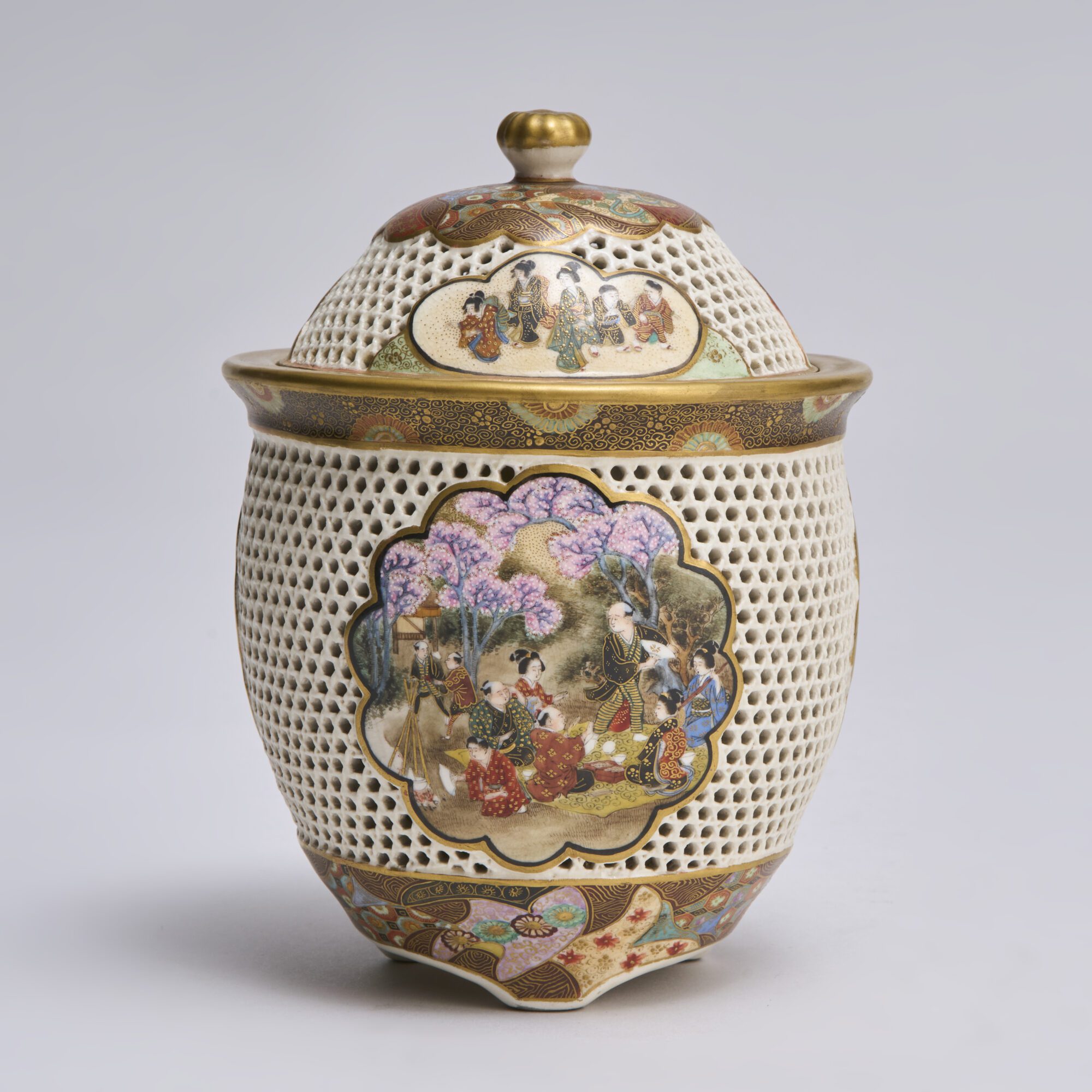 The Koro (incense burner) has finely painted panels suspended in a delicately pierced ground that resembles lace. The panels are decorated with scenes of Bijin and Noblemen in a Cherry Blossom forest.
