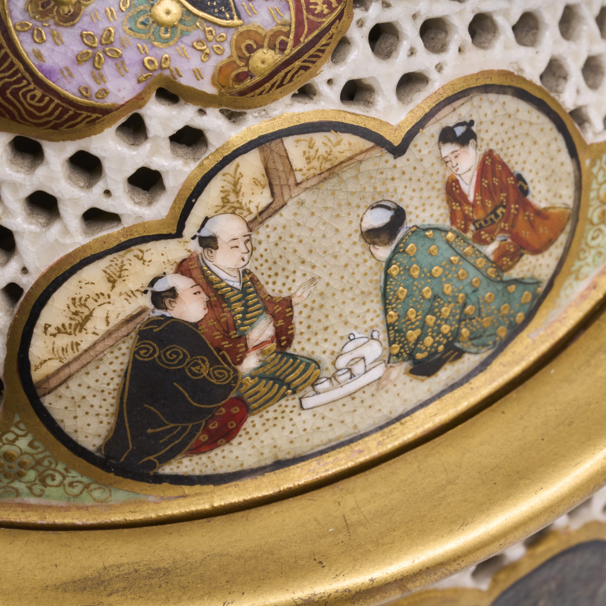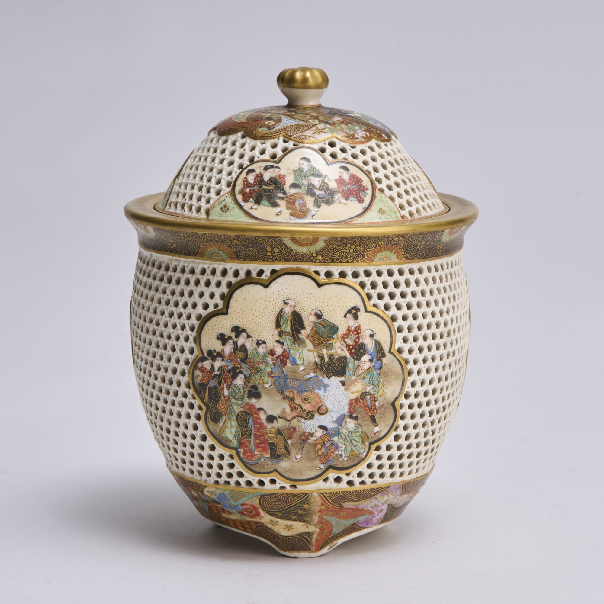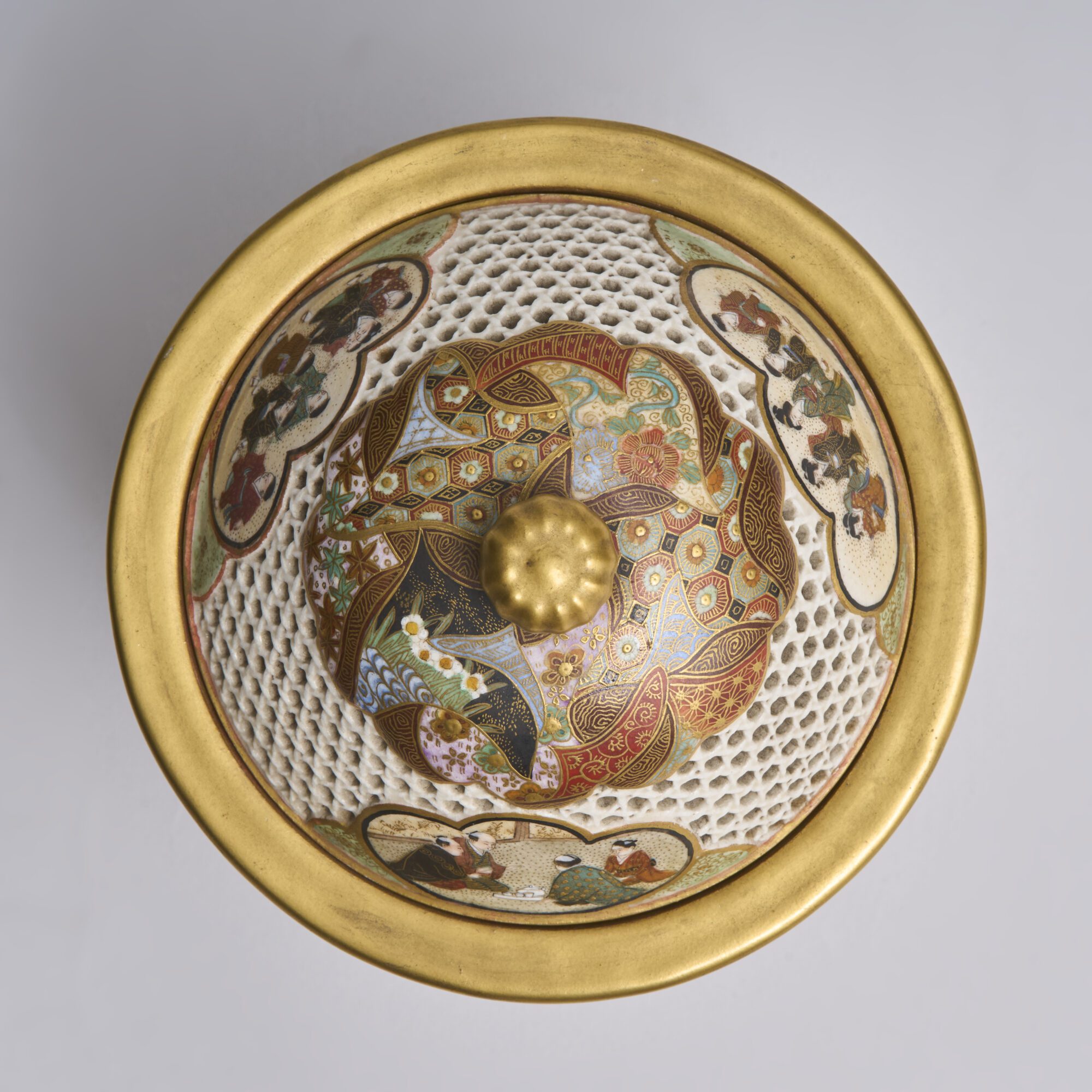 The Koro (incense burner) has finely painted panels suspended in a delicately pierced ground that resembles lace. The panels are decorated with scenes of Bijin and Noblemen in a Cherry Blossom forest.