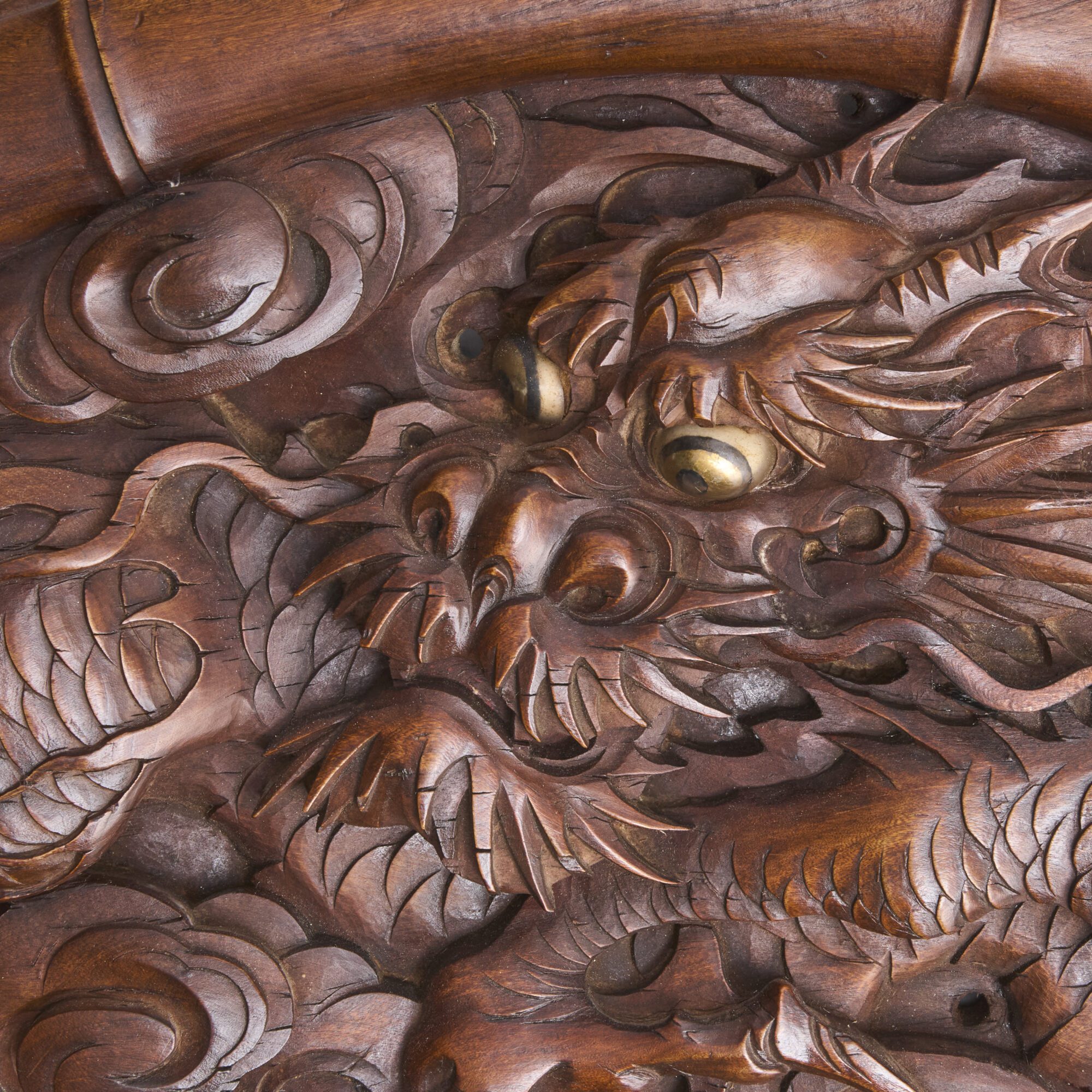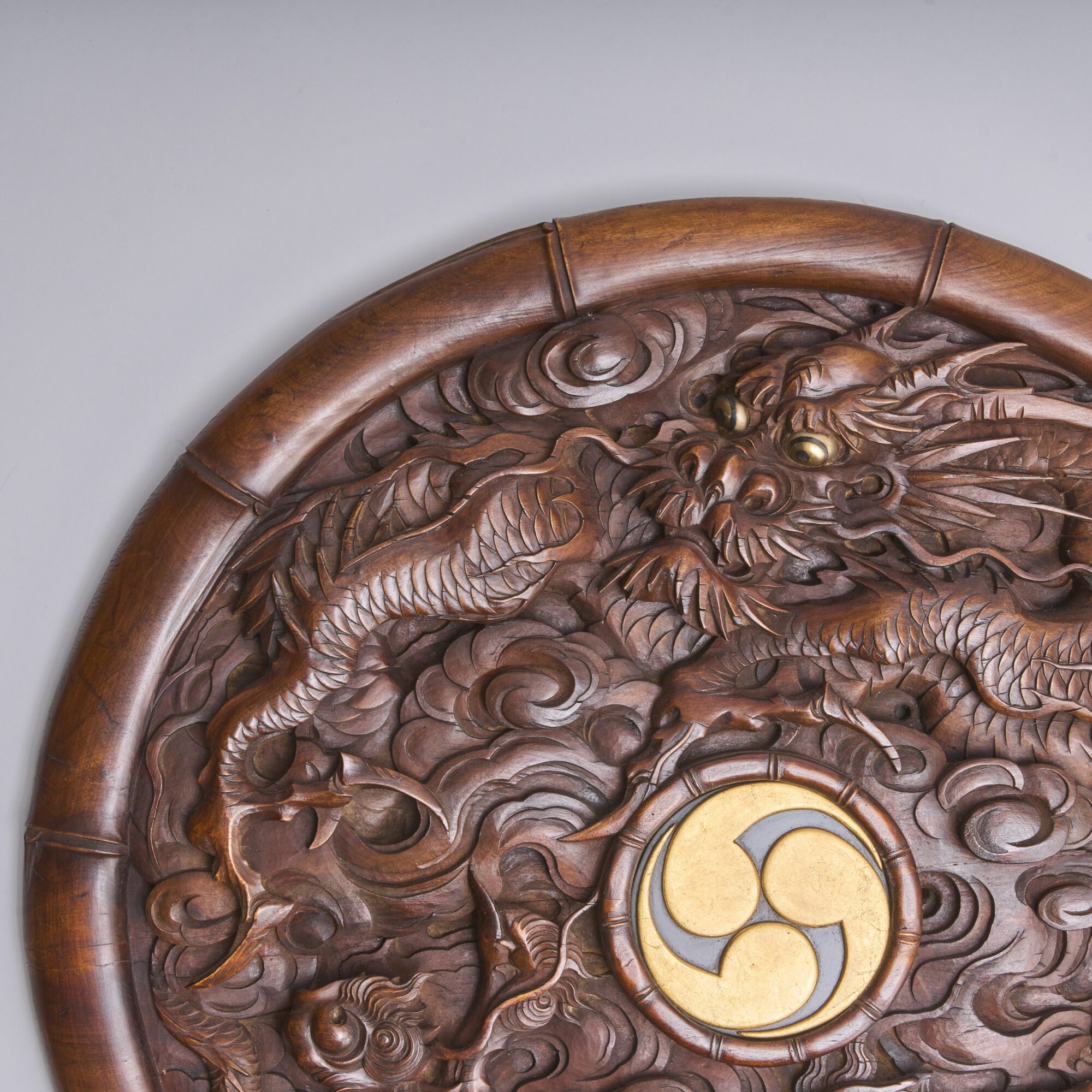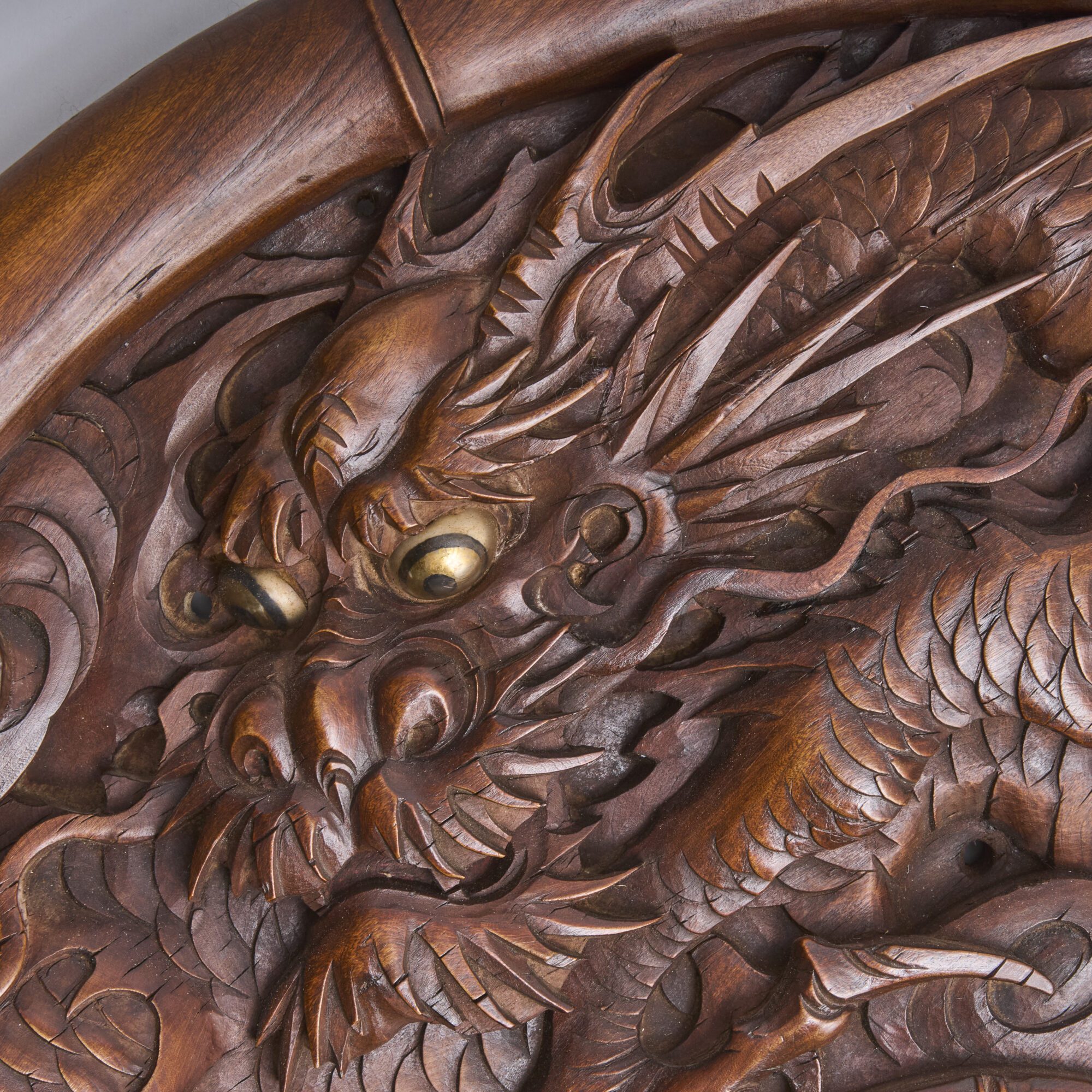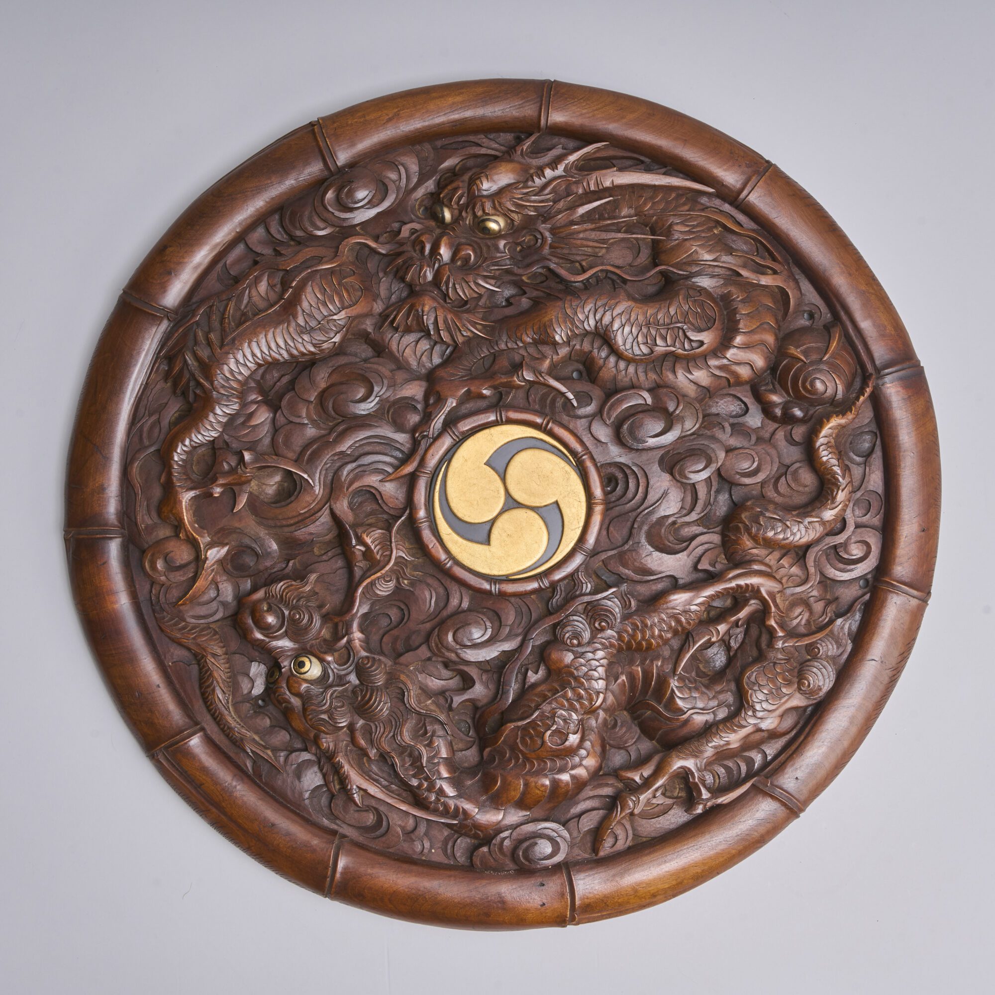 From our collection of Japanese fine art and antiques, this striking and unusual, large wooden wall plaque in the form of a Wheel and depicting a pair of Dragons.
